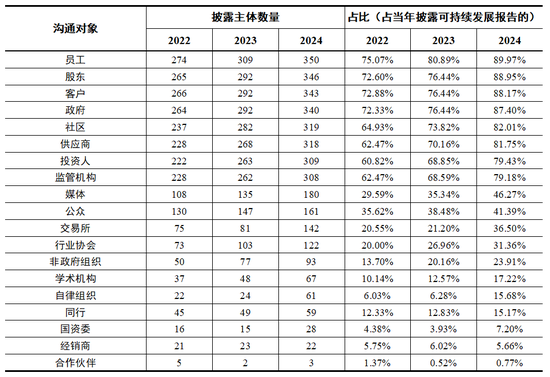 2022至2024年度,与利益相关方沟通的上市公司数量逐年提升。2024年度,389家已披露可持续发展相关报告的强制披露主体中,93.32%(363家)的上市公司已披露了与利益相关方沟通的相关信息。其中,员工、股东和客户为主要沟通对象,分别有89.97%(350家)、88.95%(346家)和88.17%(343家)的公司披露与其开展交流。