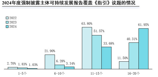 2022至2024年度,强制披露主体的可持续报告覆盖《指引》议题数量呈上升趋势。2024年度,389家已披露可持续发展相关报告的强制披露主体中,暂无上市公司覆盖《指引》所有21项议题,61.95%(241家)的主体覆盖16-20项议题。此外,11.83%(46家)的主体覆盖了“科技伦理”的议题,占比最低。