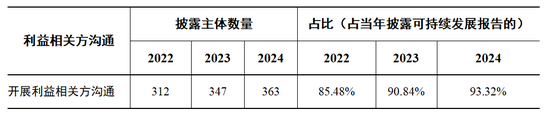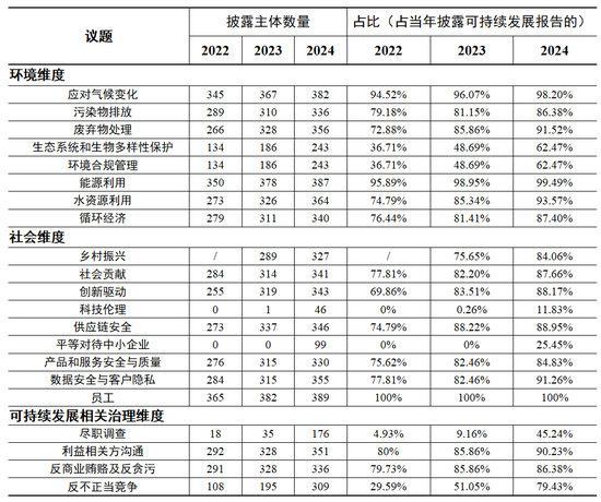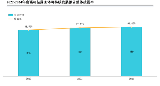 整体来看,2022至2024年度,绝大部分强制披露主体已披露可持续发展报告,2024年度披露率达94.42%(389家)。