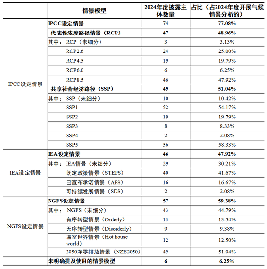 2024年度,389家已披露可持续发展相关报告的强制披露主体中,23.30%(96家)的公司开展了气候情景分析。其中,主要使用的是政府间气候变化专门委员会(IPCC)和央行与监管机构绿色金融网络(NGFS)发布的情景模型,分别为77.08%(74家)和59.38%(57家)。