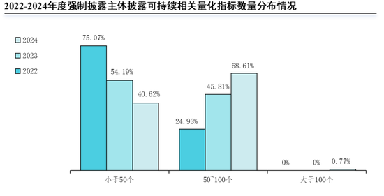 2022至2024年度,强制披露主体披露可持续相关量化指标的数量呈上升趋势。2024年度,389家已披露可持续发展相关报告的强制披露主体中,量化指标披露数量为50-100之间的公司占比为58.61%(228家)。