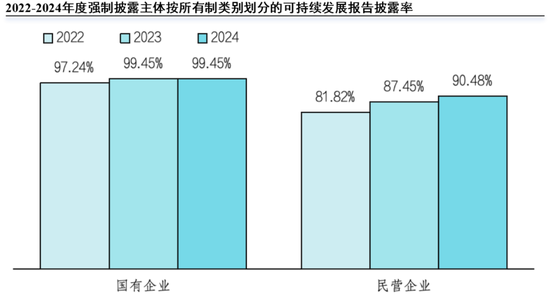 从所有制类别来看,2022至2024年度,国有控股上市公司强制披露主体的披露率均高于民营企业、公众企业等。2024年度,非国有企业强制披露主体的披露率已达90.48%(209家),国有企业的强制披露主体的披露率为99.45%(180家)。