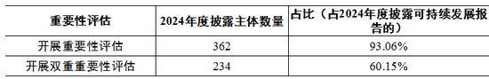 2024年度,389家已披露可持续发展相关报告的强制披露主体中,93.06%(362家)的上市公司开展议题重要性评估,60.15%(234家)开展了双重重要性评估分析。