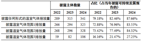2022至2024年度,披露温室气体排放量的强制披露主体数量呈上升趋势。2024年度,389家已披露可持续发展相关报告的强制披露主体中,披露任何形式的温室气体排放量的公司占87.66%(341家),披露温室气体范围1排放量的公司占83.55%(325家),披露范围2的公司占84.32%(328家),披露范围3的公司占比达27.25%(106家)。