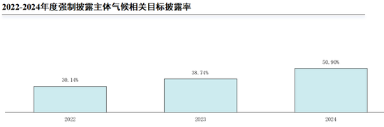 2022至2024年度,披露温室气体减排定量目标[2]的强制披露主体数量呈上升趋势。2024年度,389家已披露可持续发展相关报告的强制披露主体中,50.90%(198家)的公司披露了温室气体减排定量目标。