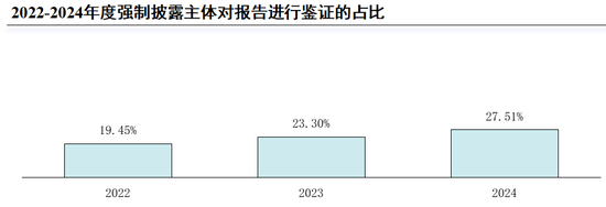 2022至2024年度,聘请第三方机构对可持续发展报告进行鉴证的强制披露主体数量呈上升趋势。2024年度,389家已披露可持续发展相关报告的强制披露主体中,有27.51%(107家)聘请第三方机构对可持续发展报告整体或部分数据进行鉴证,并披露相关鉴证报告。