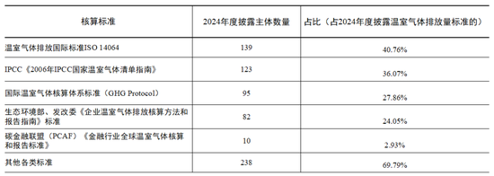 2024年度,389家已披露可持续发展相关报告的强制披露主体中,87.66%(341家)披露了核算标准。其中,使用温室气体排放国际标准ISO 14064的占比最高,为40.76%(139家);其次为《2006年IPCC国家温室气体清单指南》,占比36.07%(123家)。