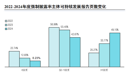 2022至2024年度,强制披露主体的可持续发展报告篇幅不断增加。其中,2024年度近一半(49.10%,191家)强制披露主体的可持续发展报告超过了100页,8.23%的报告少于50页。