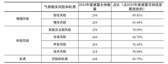 2024年度,披露各类气候相关风险类型的强制披露主体数量较为平均。其中,披露“政策及法规风险”的占比最高,达70.95%(276家)。