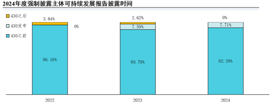2022至2024年度,绝大部分强制披露主体在4月30日之前披露了可持续发展报告。2024年度,389家已披露可持续发展相关报告的强制披露主体中,分别有92.29%(359家)和7.71%(30家)的公司在4月30日之前和4月30日当天披露可持续发展报告。