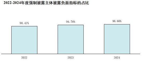 2022至2024年度,绝大部分强制披露主体均已至少披露以下一项负面指标,2024年度披露率达96.66%(376家)。
